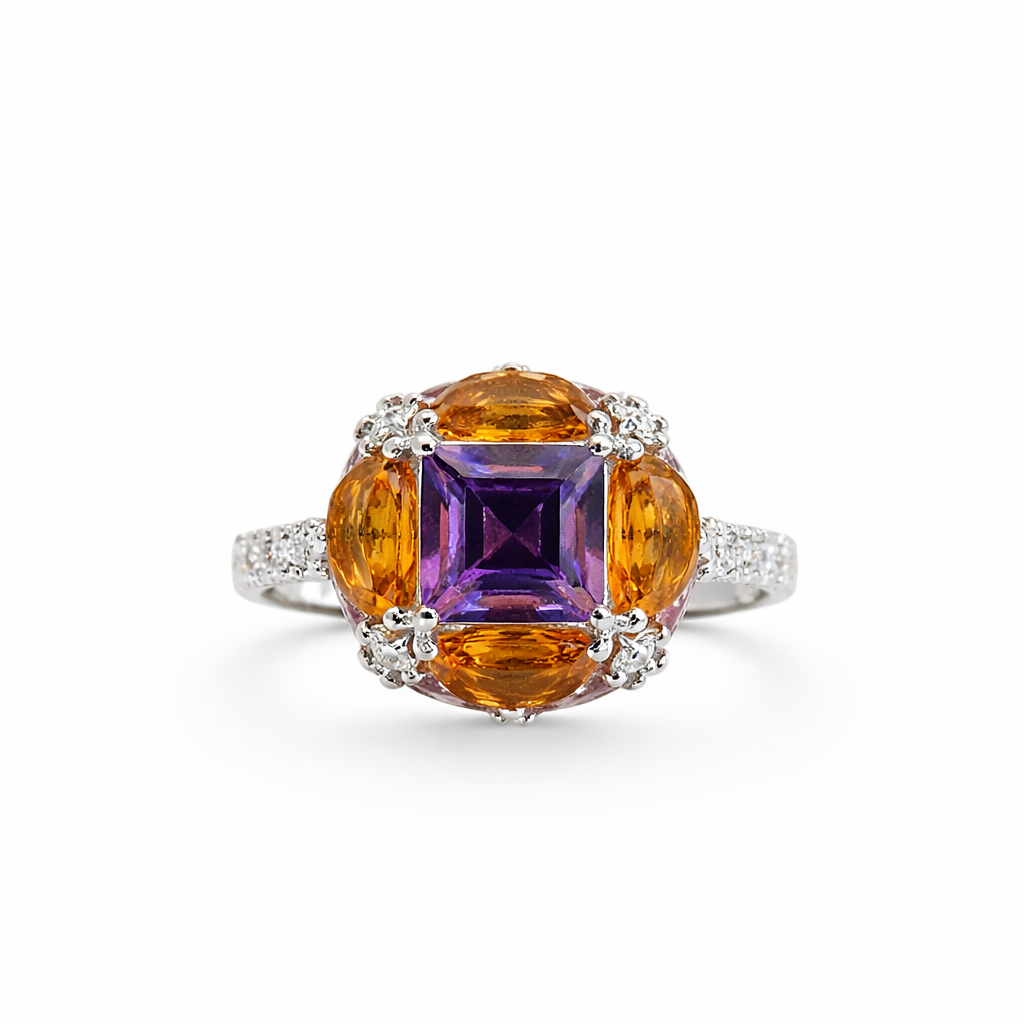 Clean lines meet vivid gemstones in this architectural stunner. A square amethyst sits at the centre, flanked by four half-moon yellow citrines and marquise pink tourmalines, a bold, considered arrangement that feels both modern and timeless. Set in 18kt white gold with natural diamonds.