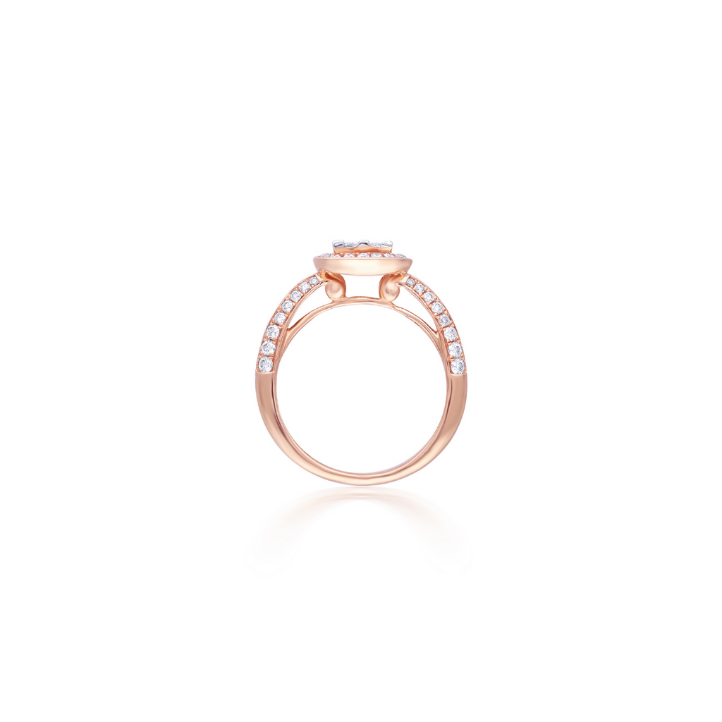 Elegant and chic, the princess paradise ring features our flawless princess diamonds in an illusion setting bordered by round diamonds set on 18kt rose gold. The princess paradise ring is beautiful and luxurious and also has round diamonds on the band making it perfect for parties and celebrations.